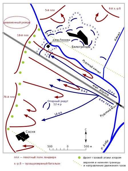 Частично боевой потенциал наступающих был уничтожен ими самими. На ряде участков пехота столь рьяно устремилась вперёд, что на полном ходу забежала в облако газов, предназначавшихся для русских. В результате из строя выбыли несколько сотен немецких солдат.
