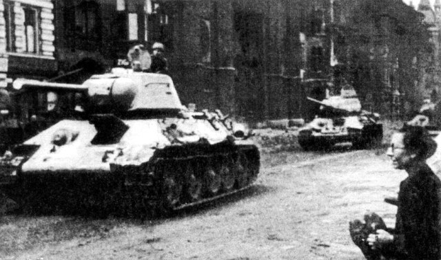 Один Т-34 появился на дороге прямо перед моим домом. Наша 3,7-сантиметровая пушка по нему выстрелила, но снаряд отскочил от брони. Началась гонка вокруг дома - танк двигался, чтобы обойти противотанковую пушку. Другой Т-34 заметил мой броневик в сарае. С короткой дистанции он выстрелил по броневику, затем таранил его и вдвинул вглубь сарая, - на броневик обрушилась крыша сарая, и так я остался без своего «танка», и дальше воевать мне стало намного труднее. Теперь началась еще одна гонка вокруг дома – мы бежали, а за нами ехал Т-34. На втором кругу Т-34 застрял в болоте. Мы стреляли ему в башню из ручного оружия, и потом подорвали миной. Тем временем остальные Т-34 поехали по направлению к нашему штабу, но там их смогли всех уничтожить, потому что у них не было радио. Мой броневик, к сожалению, погиб, но второй атаки русских не последовало».